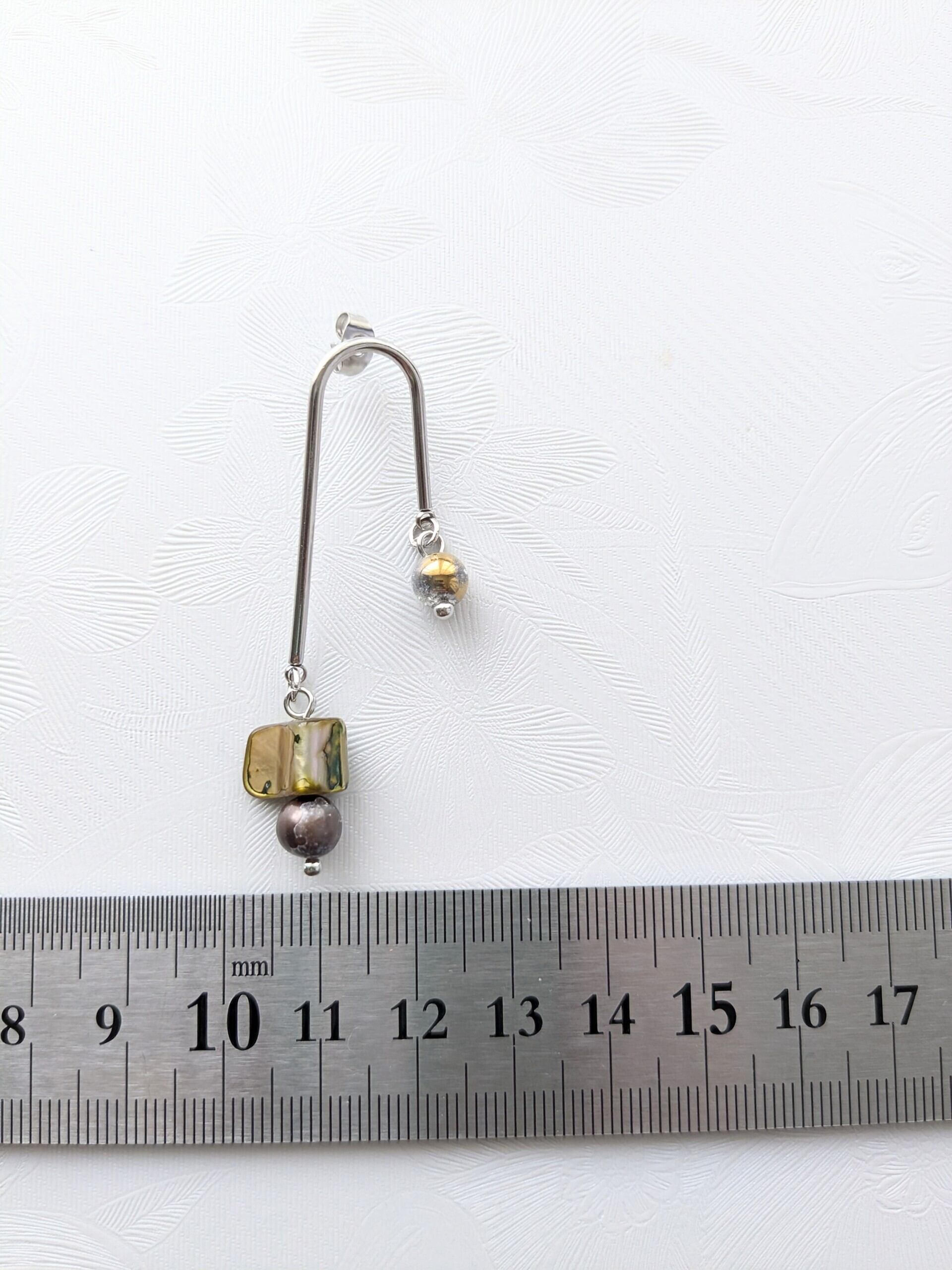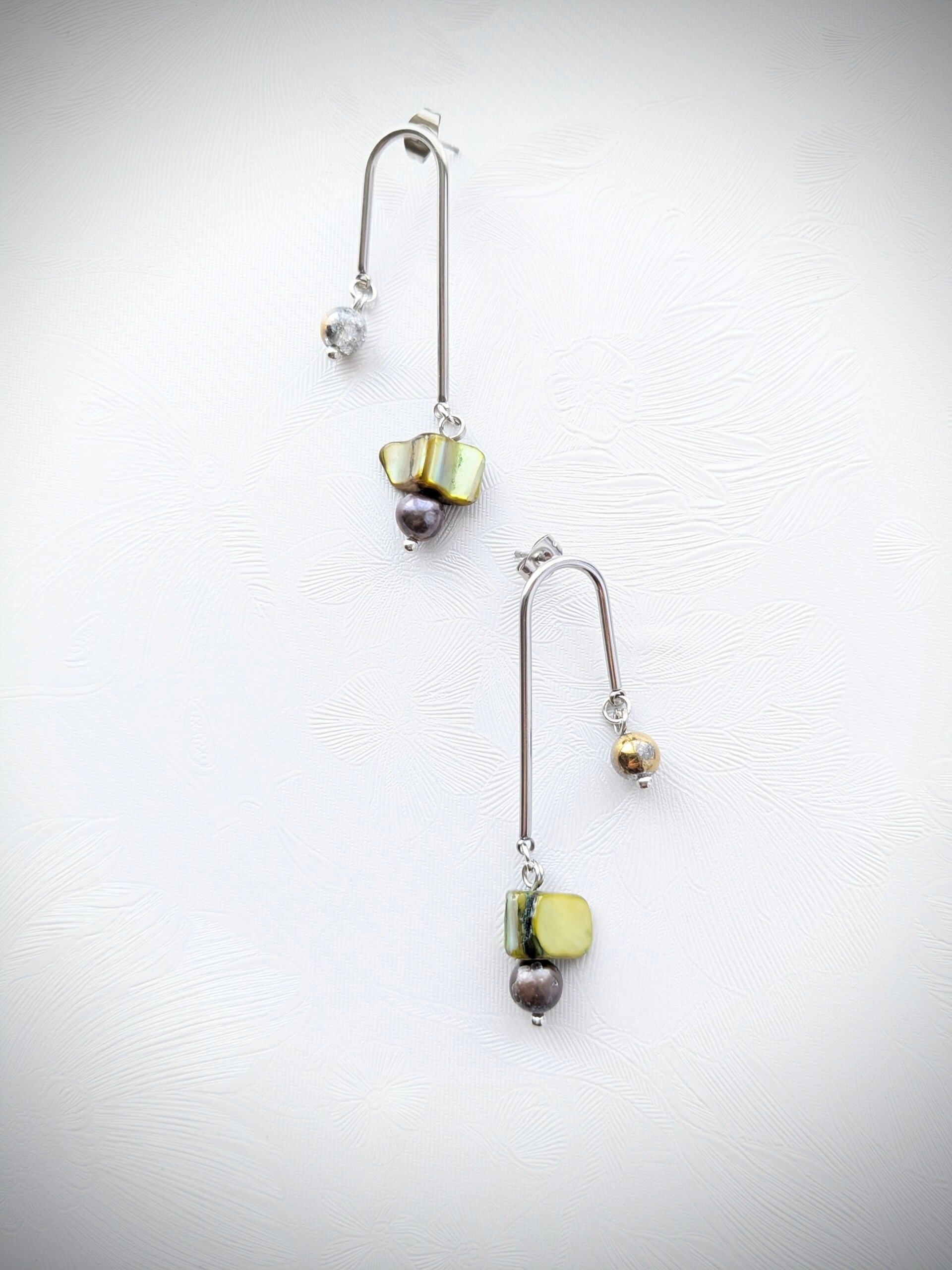 同じ形は2つとない、グリーンのシェルが先端でゆらゆらと優しくひかります。左右を着けかえる事でまた見えるバランスが変わる面白いシルエットのピアスです。(お写真2枚目、3枚目をご参照ください♡)