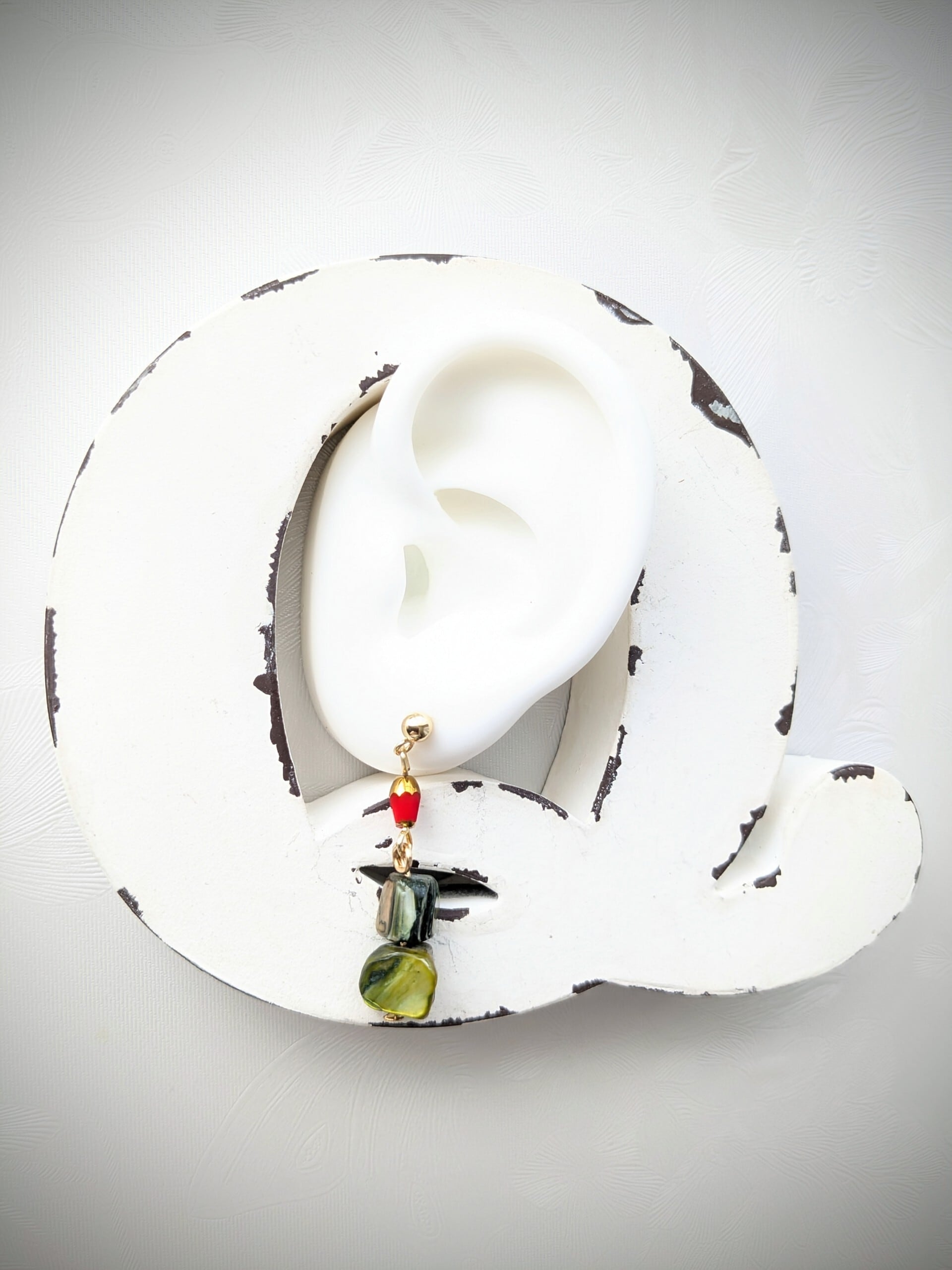 大好きなシェル。シェルのグリーンと、ヴィンテージ風ビーズの朱色のコントラストが美しい耳飾りです。