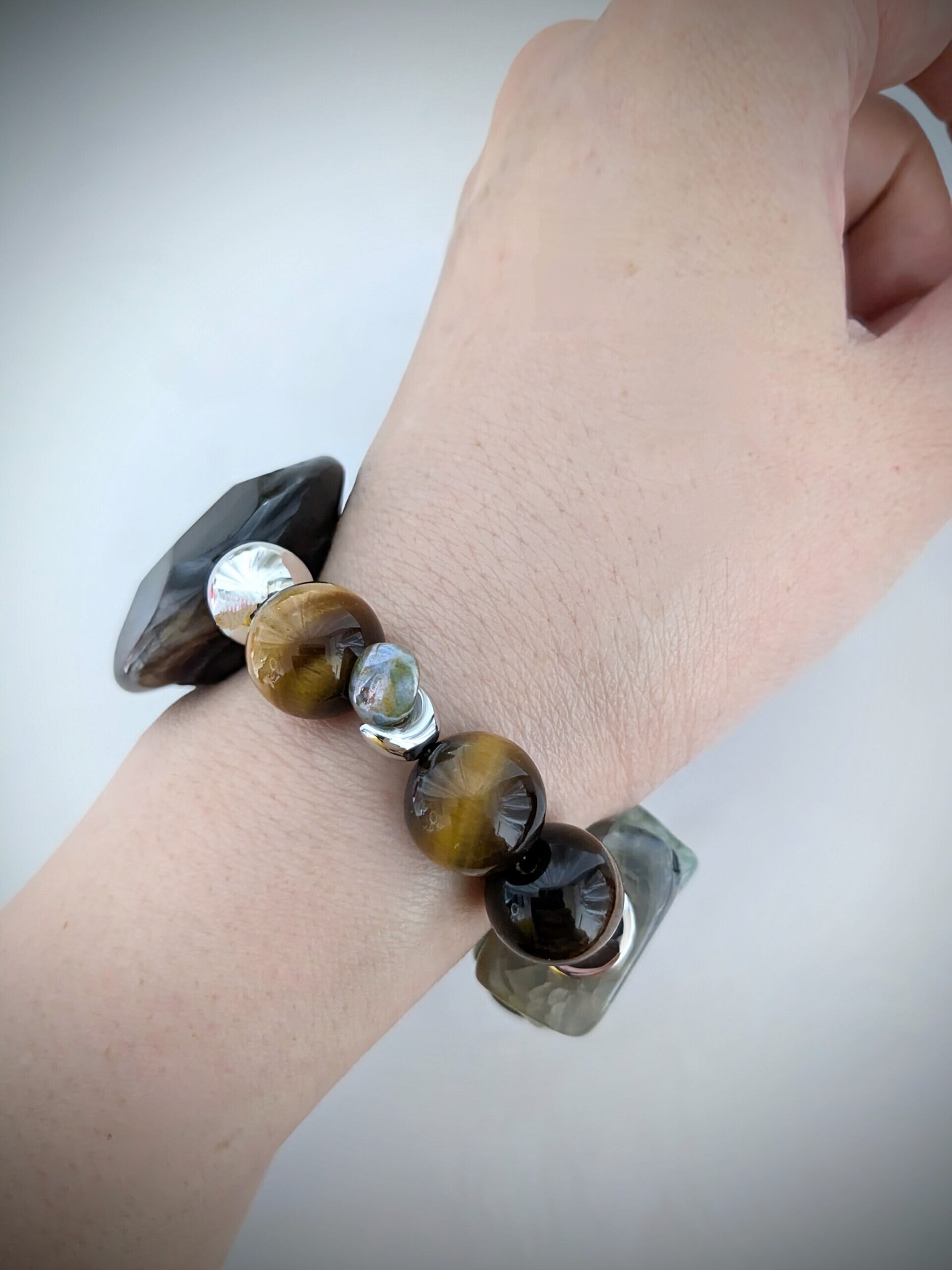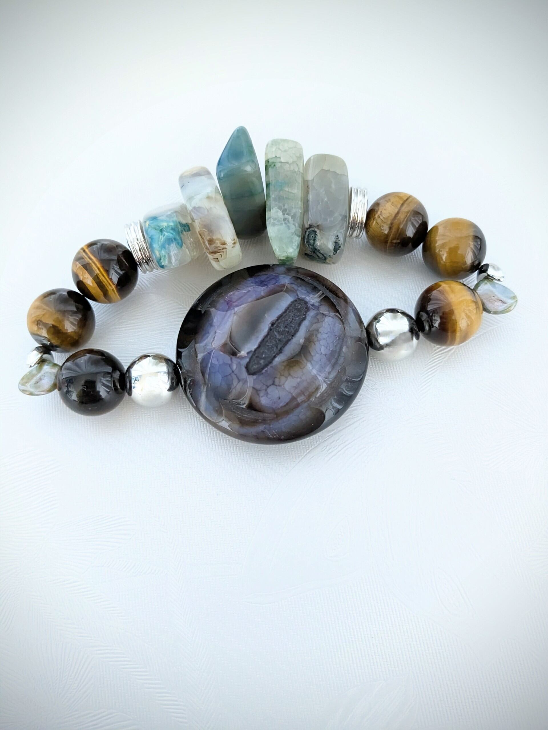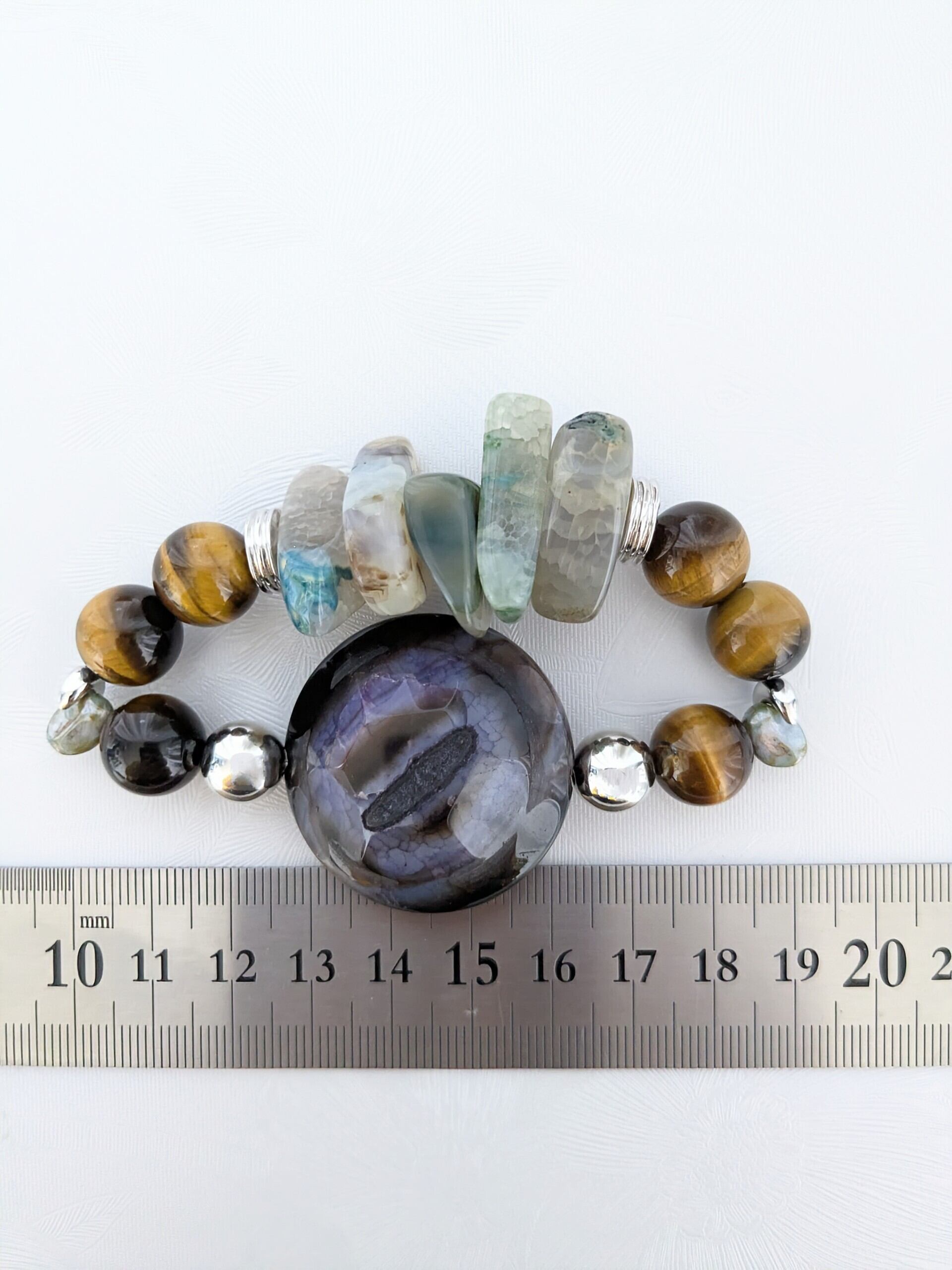 パープルブラウンの大きな丸いアゲートと、パワーを秘めたタイガーアイ。まんまるのパープルブラウンアゲートと、小さな三日月シルバーパーツが、夜の帳を彷彿とさせるような、静寂と祈りのブレスレットです。