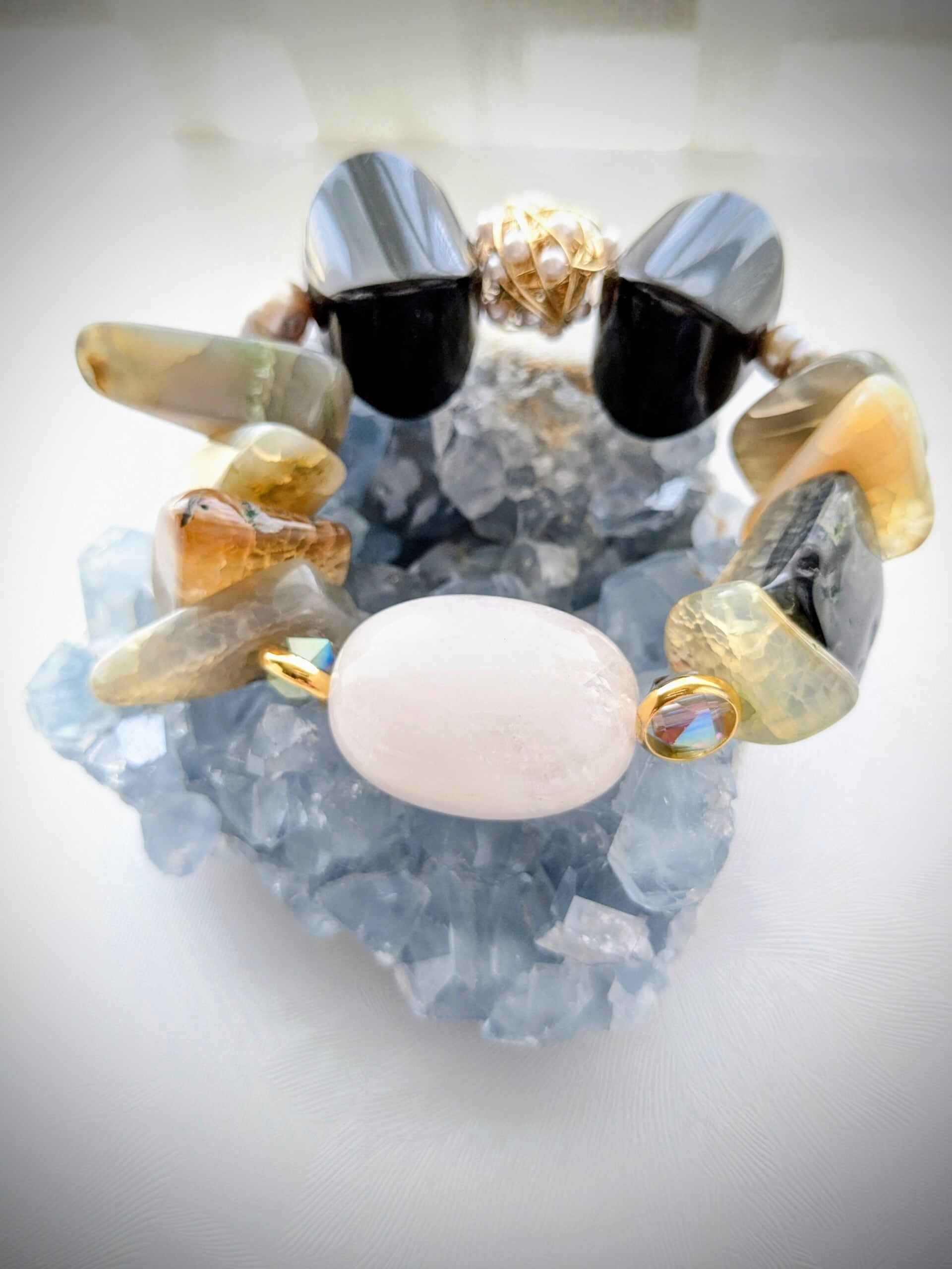 変わったカタチの大きなオニキスをリボンみたいにならべて、乙女心を忘れないブレスレットに♡