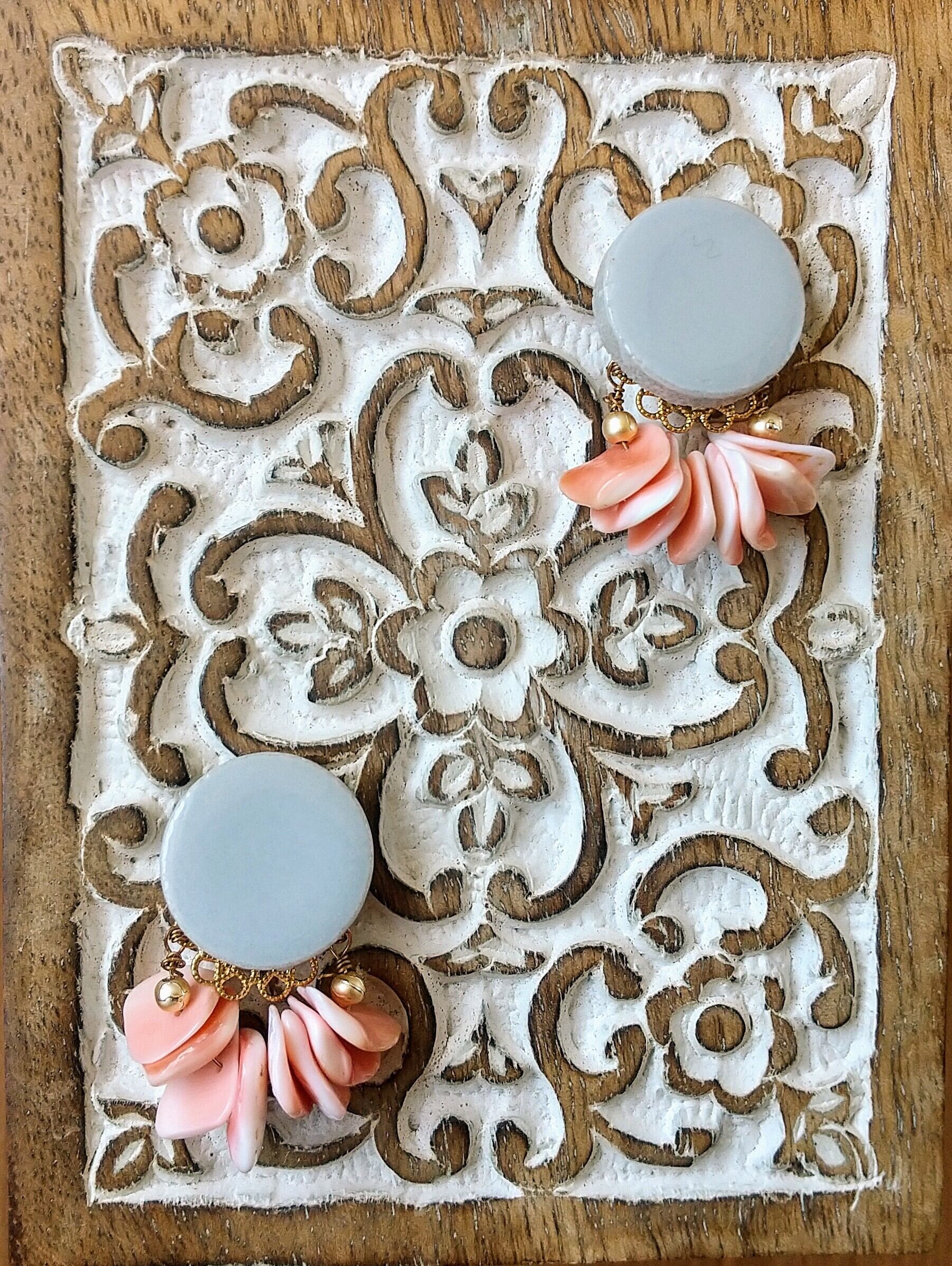 グレーのアンティークタイルに、夕焼け色の珊瑚を合わせた、何処かクラシカルなイヤリングです。